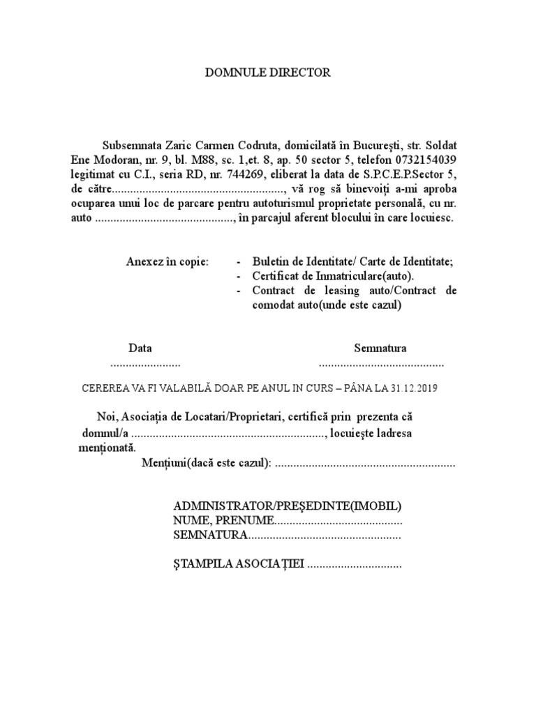 Cerere Contract De Comodat Auto Pentru Loc De Parcare Model