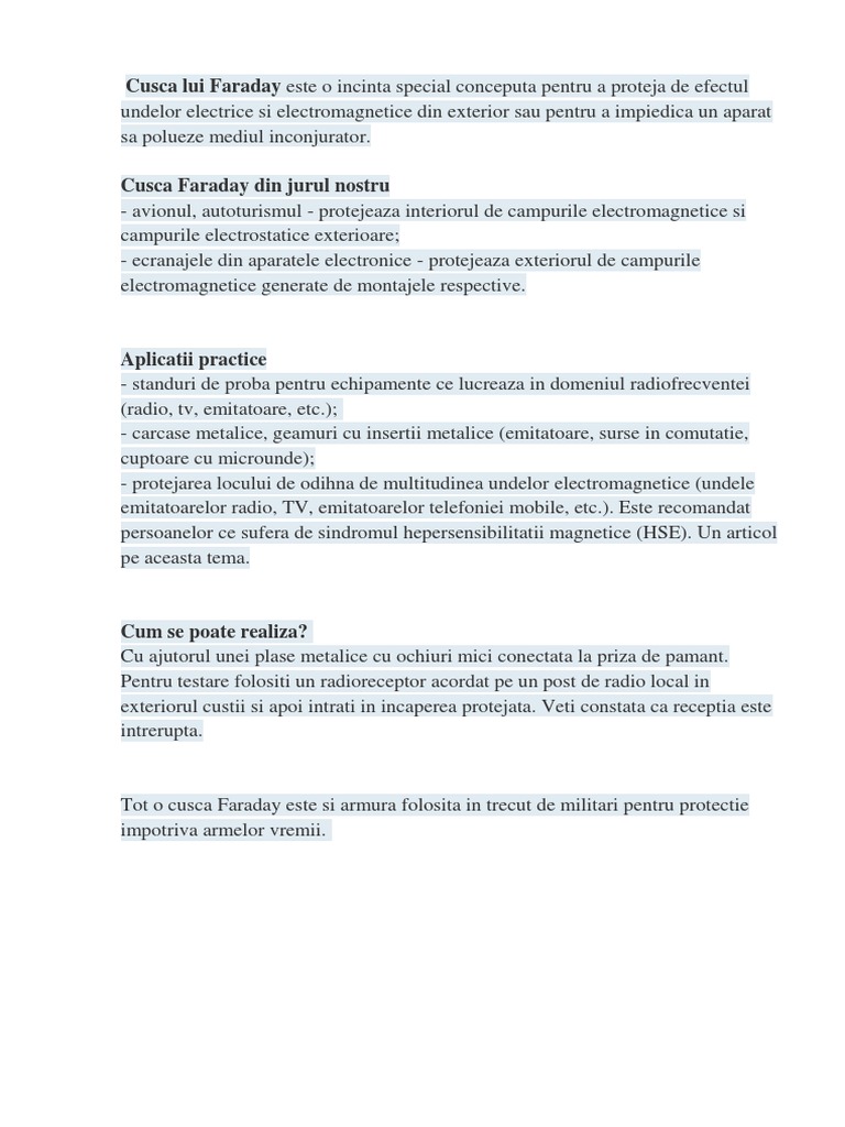 Cusca Faraday Ecranarea Electrostatică Si Electromagnetică