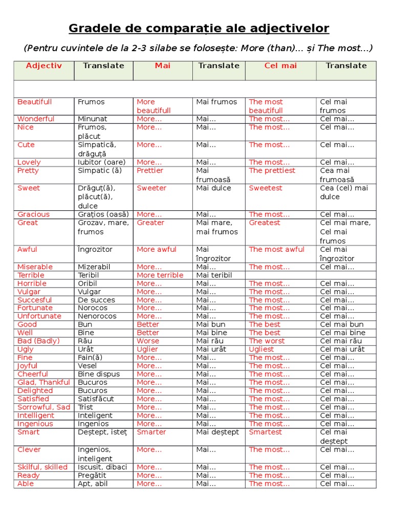 Gradele De Comparatie Ale Adjectivelor Limba Romana Pentru